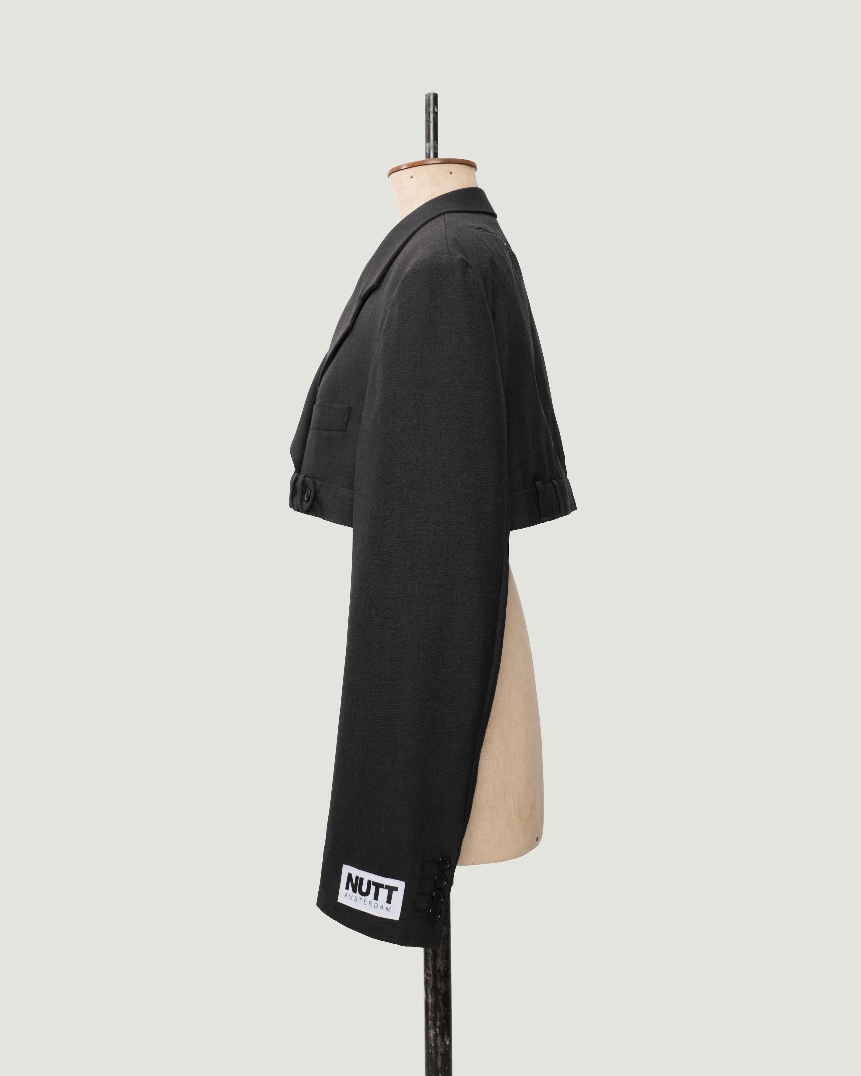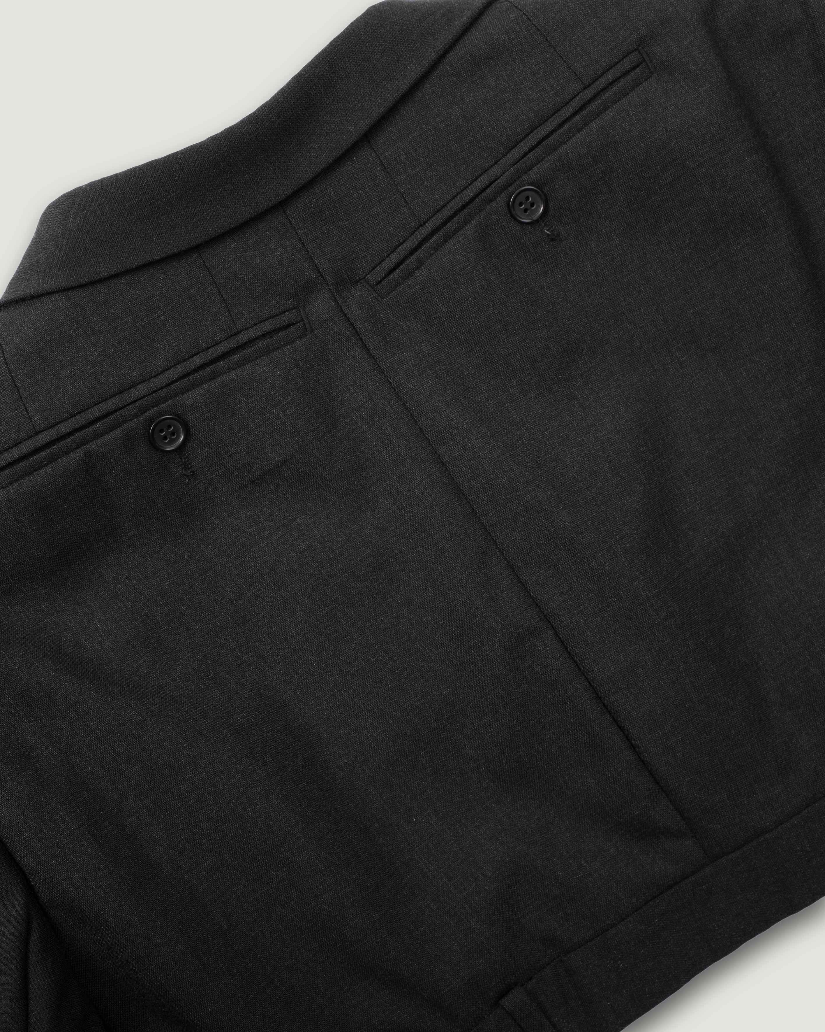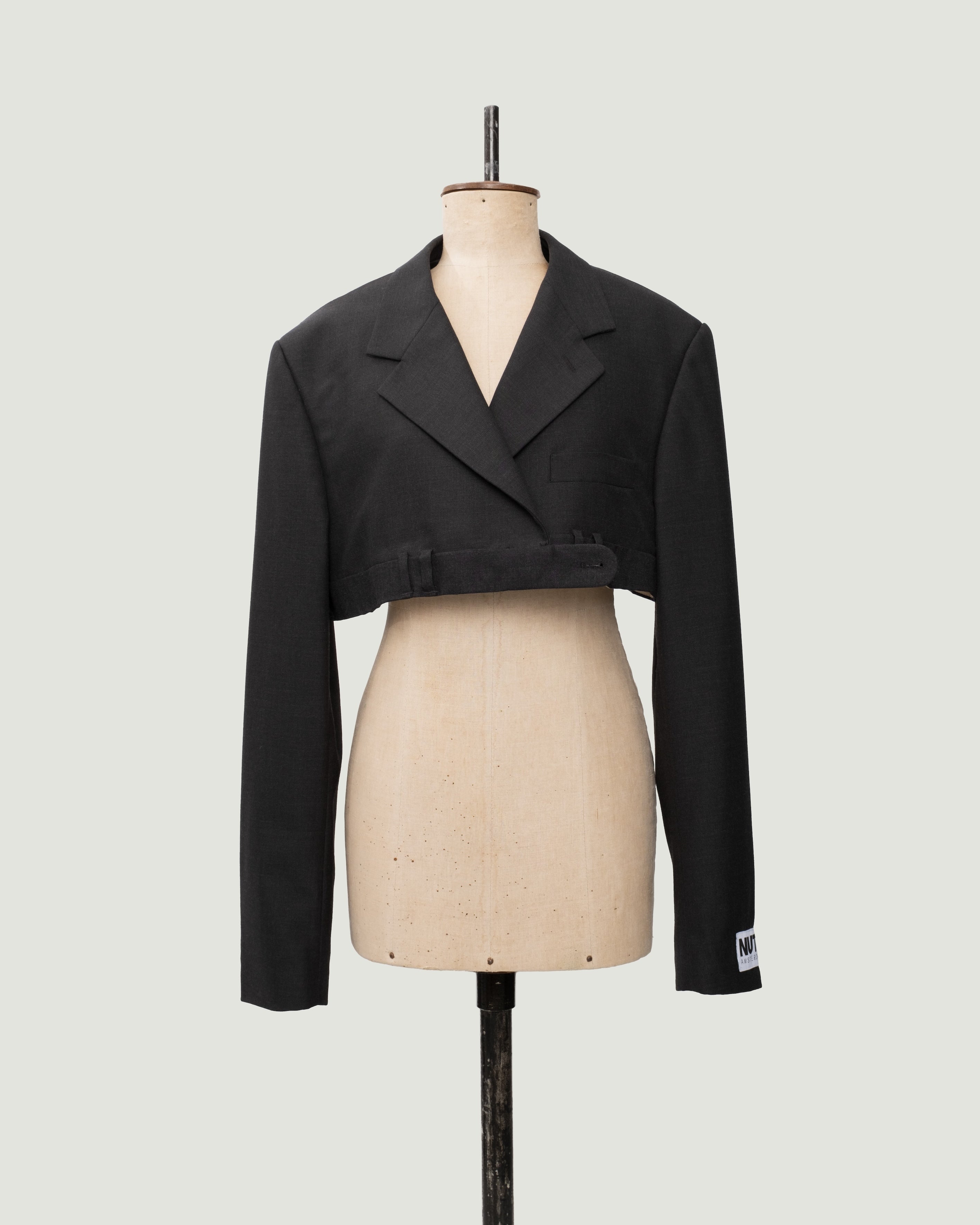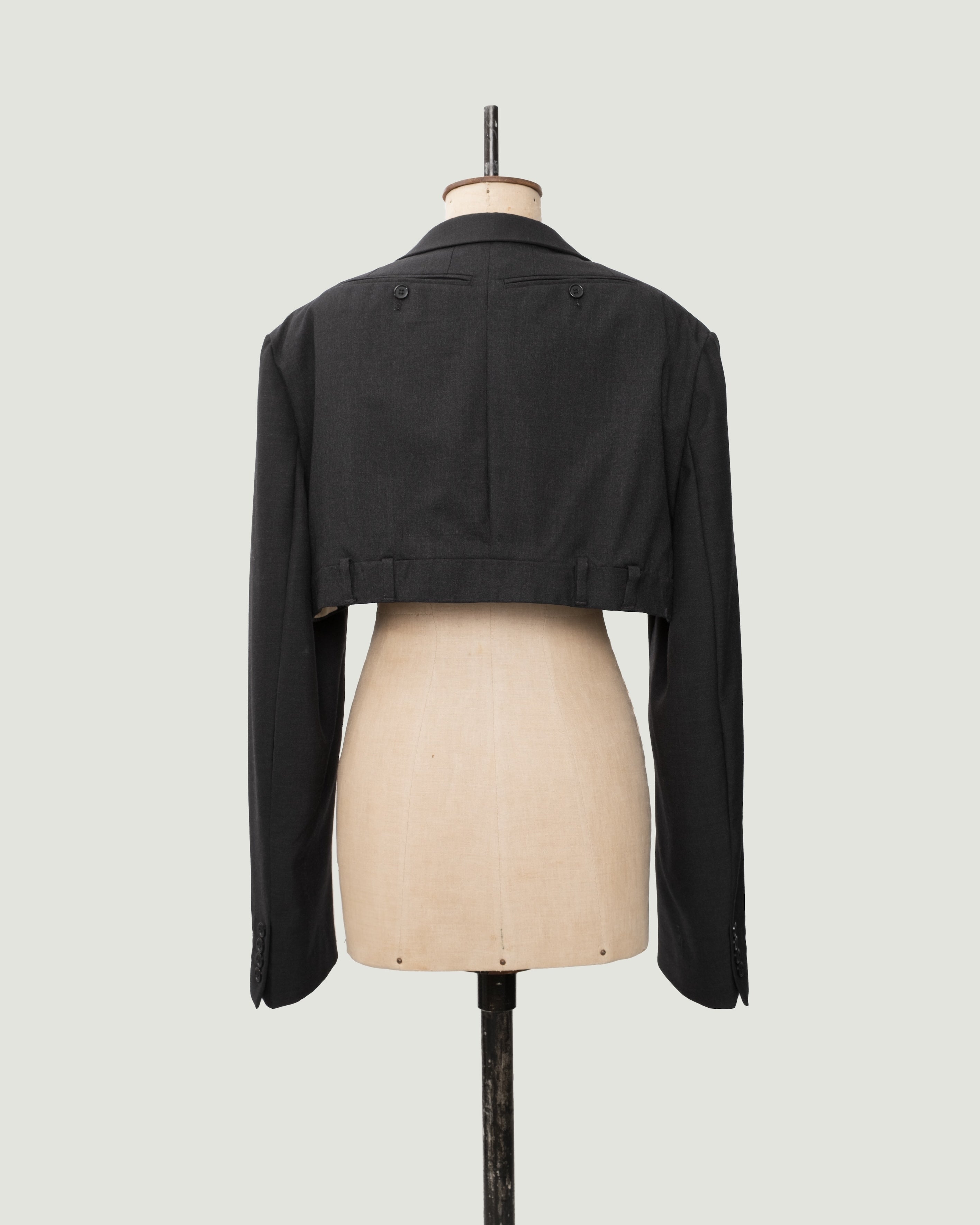 SUIT is een statement van durf en onverwachte details. De pre-loved blazer wordt een ultra-kort nieuw design, gecombineerd met een vintage pantalon, waarvan de achterzakken op de rug terugkomen en de tailleband werkt als sluiting. De extra lange mouwen versterken het al ruimvallende silhouet en geven een edgy, eigenwijze twist. Tailoring ontmoet attitude: casual, chic, en volledig uniek.