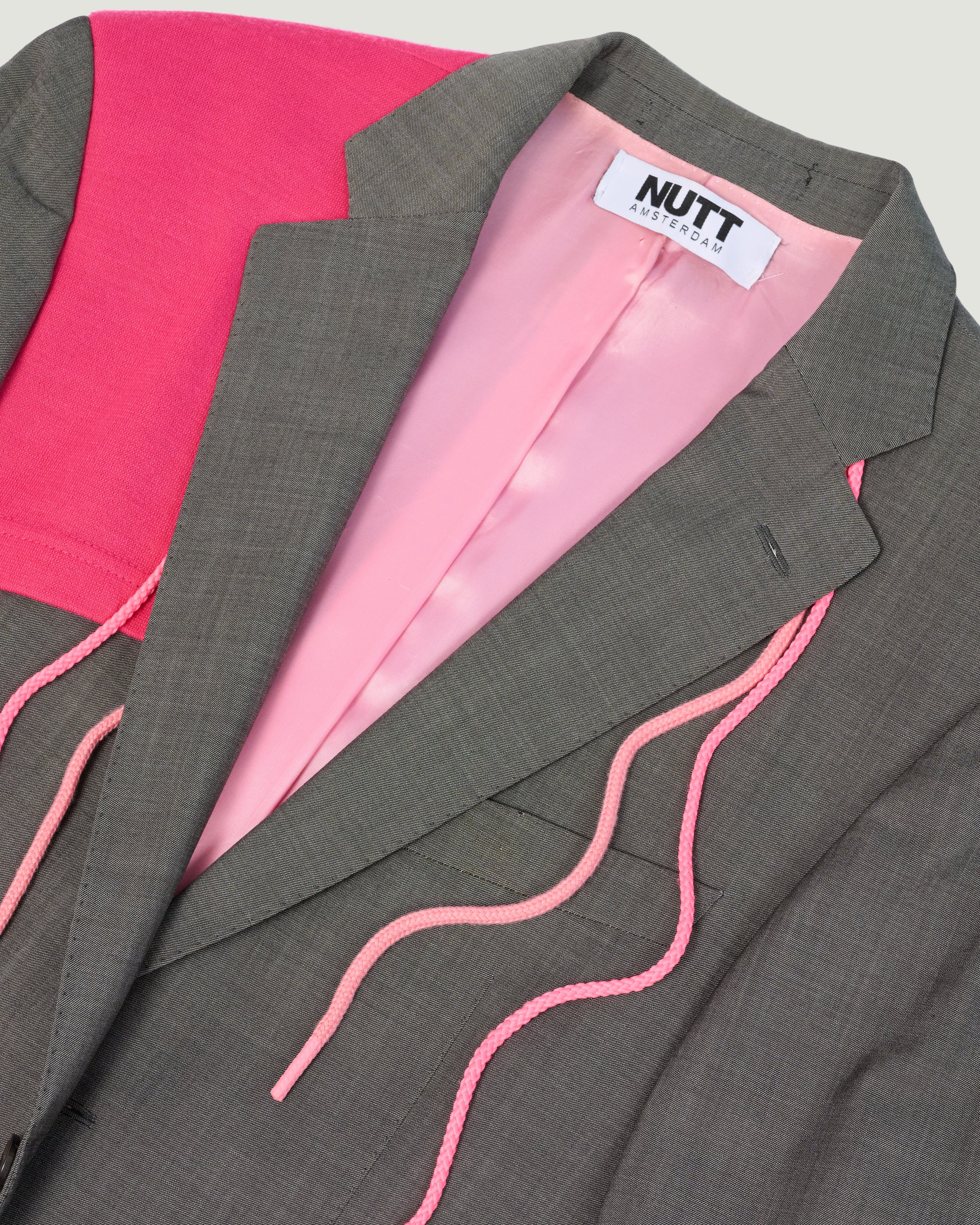 PINKIE is een samengesteld design uit een nooit-meer-gedragen grijze blazer en een gedumpte roze tricot jurk. De eigenwijze blazer valt recht, heeft een zachtroze voering en roze vlakverdelingen. De roze veters in de hals geven deze blazer een sportieve look. Je draagt hem passend of iets oversized, casual of chic.
