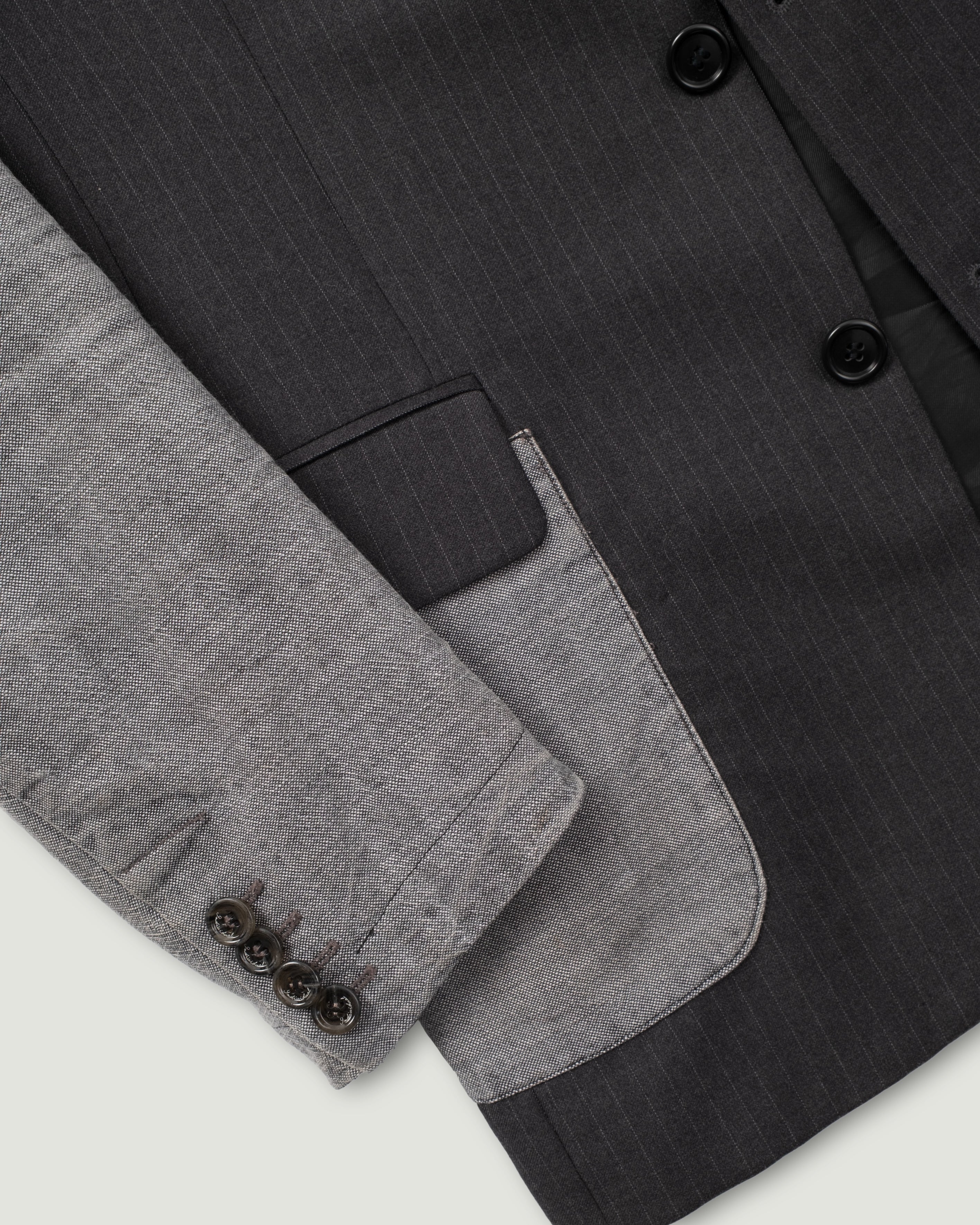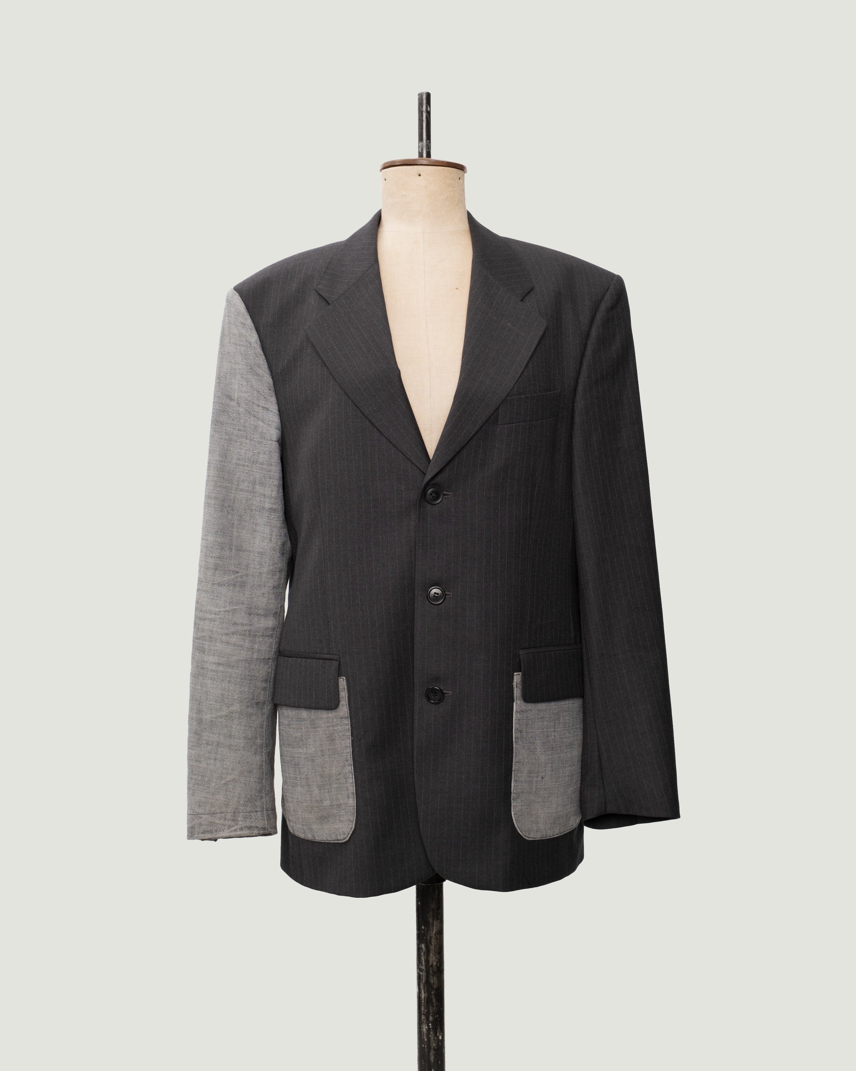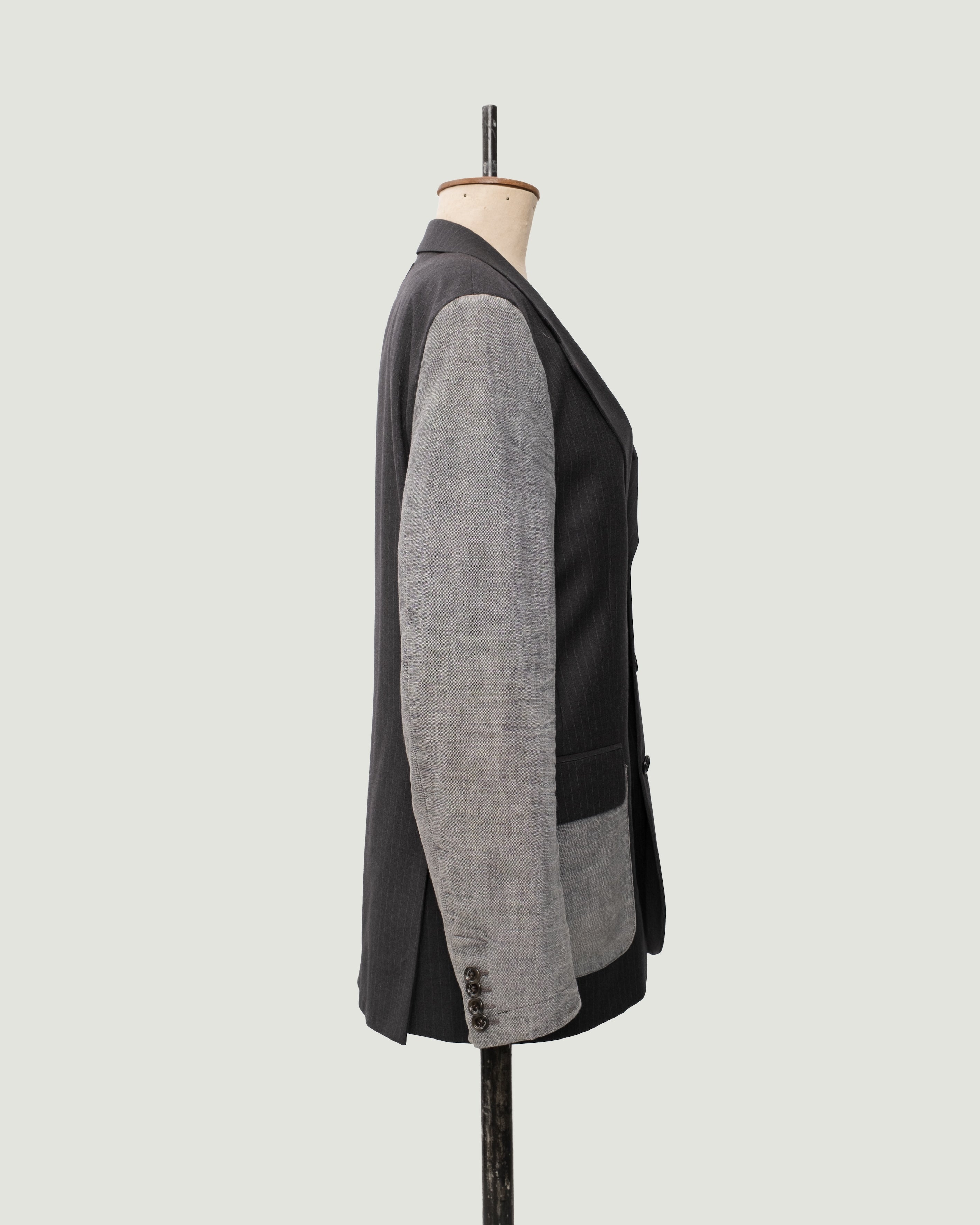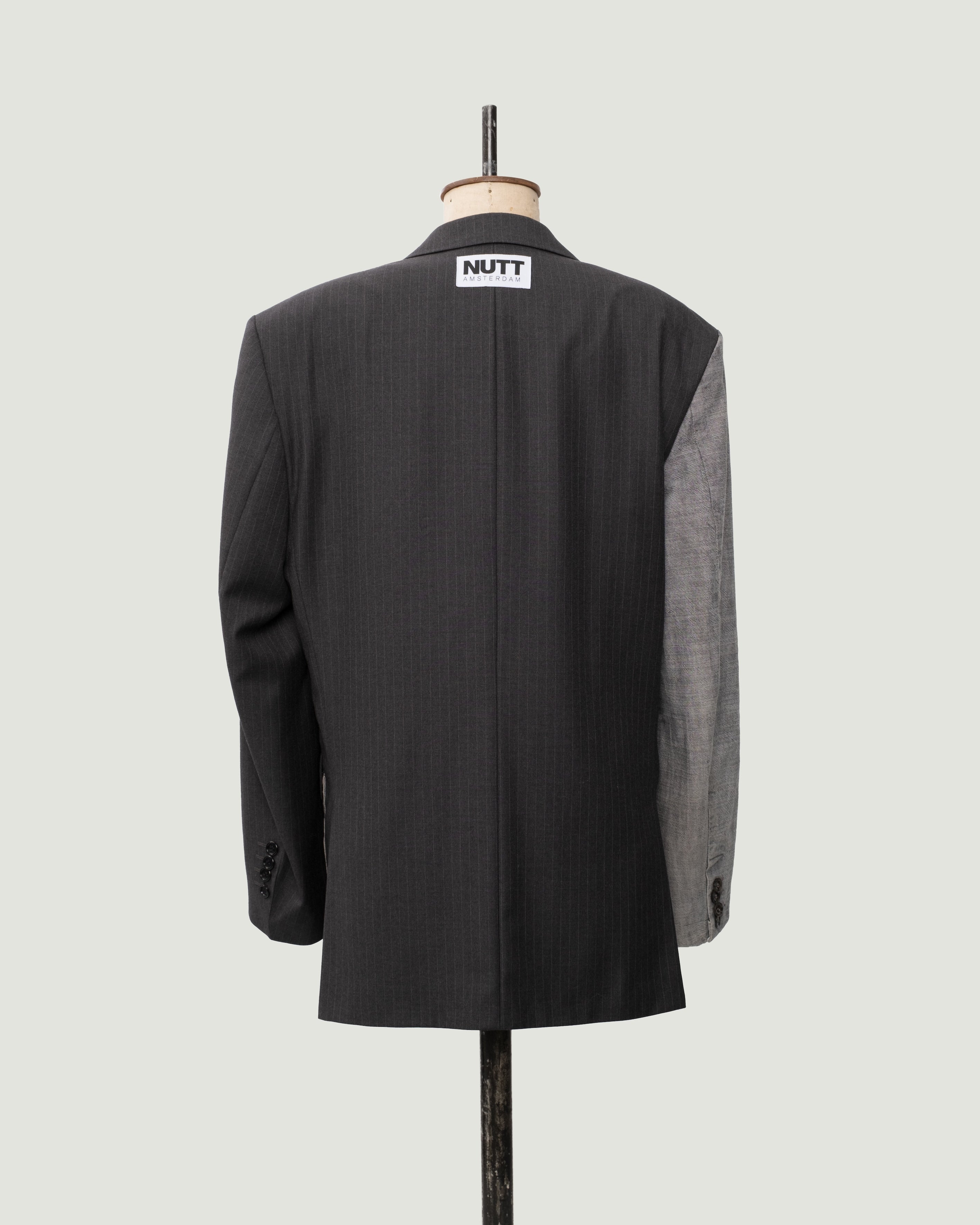 LION is krachtig, eigenzinnig en helemaal NUTT. Een vintage grijze blazer ontmoet een pre-loved katoenen jasje en vormt zo een unieke, edgy mix van materialen. Stoere zakken en een nonchalant uitgesneden mouw geven karakter en attitude, terwijl de rechte snit hem moeiteloos draagbaar maakt.