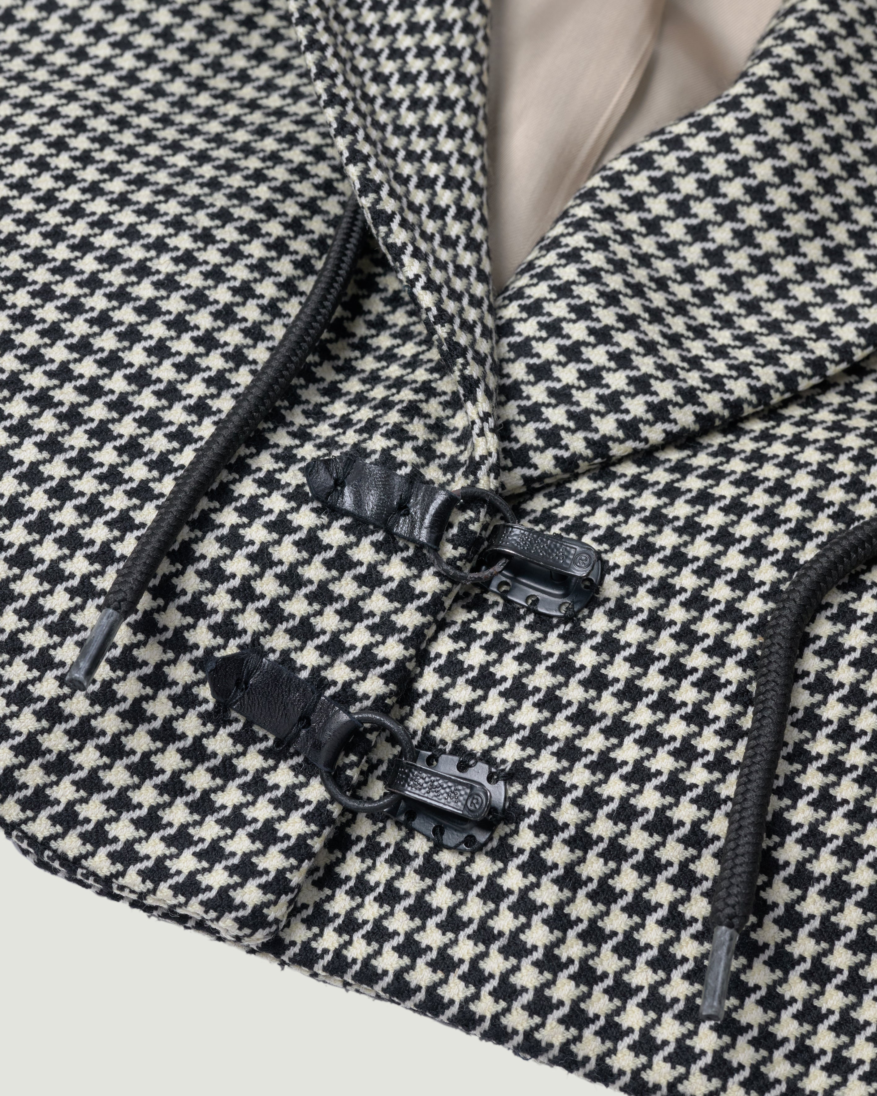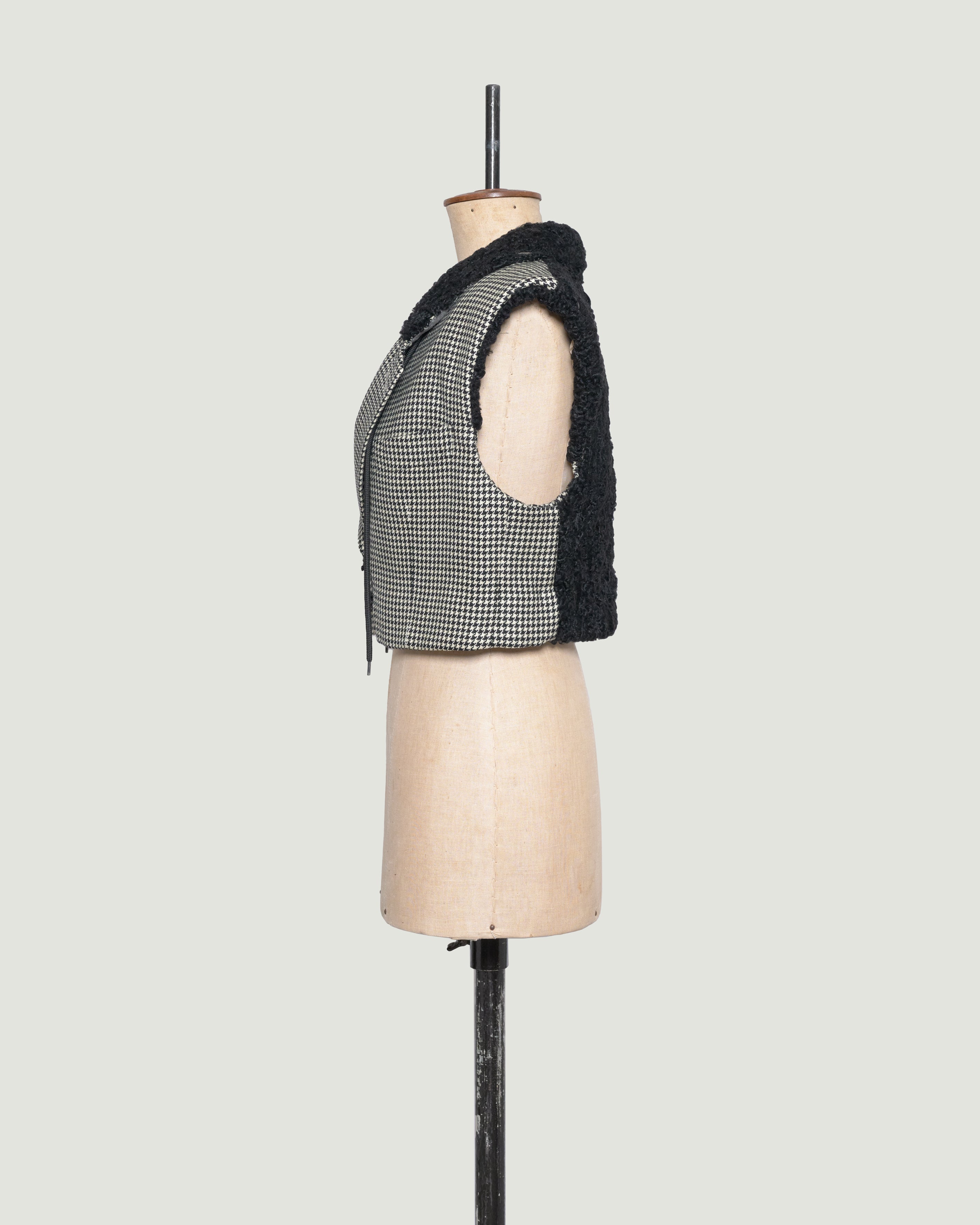 MIKE is een samengesteld design uit een afgedankte grijze blazer in pied-de-poule patroon en een nep bonten jas. Het ultrakorte, mouwloze jasje heeft een stoere look door de bijzondere sluiting en koord om de hals. Je draagt hem passend, zowel chique als casual.