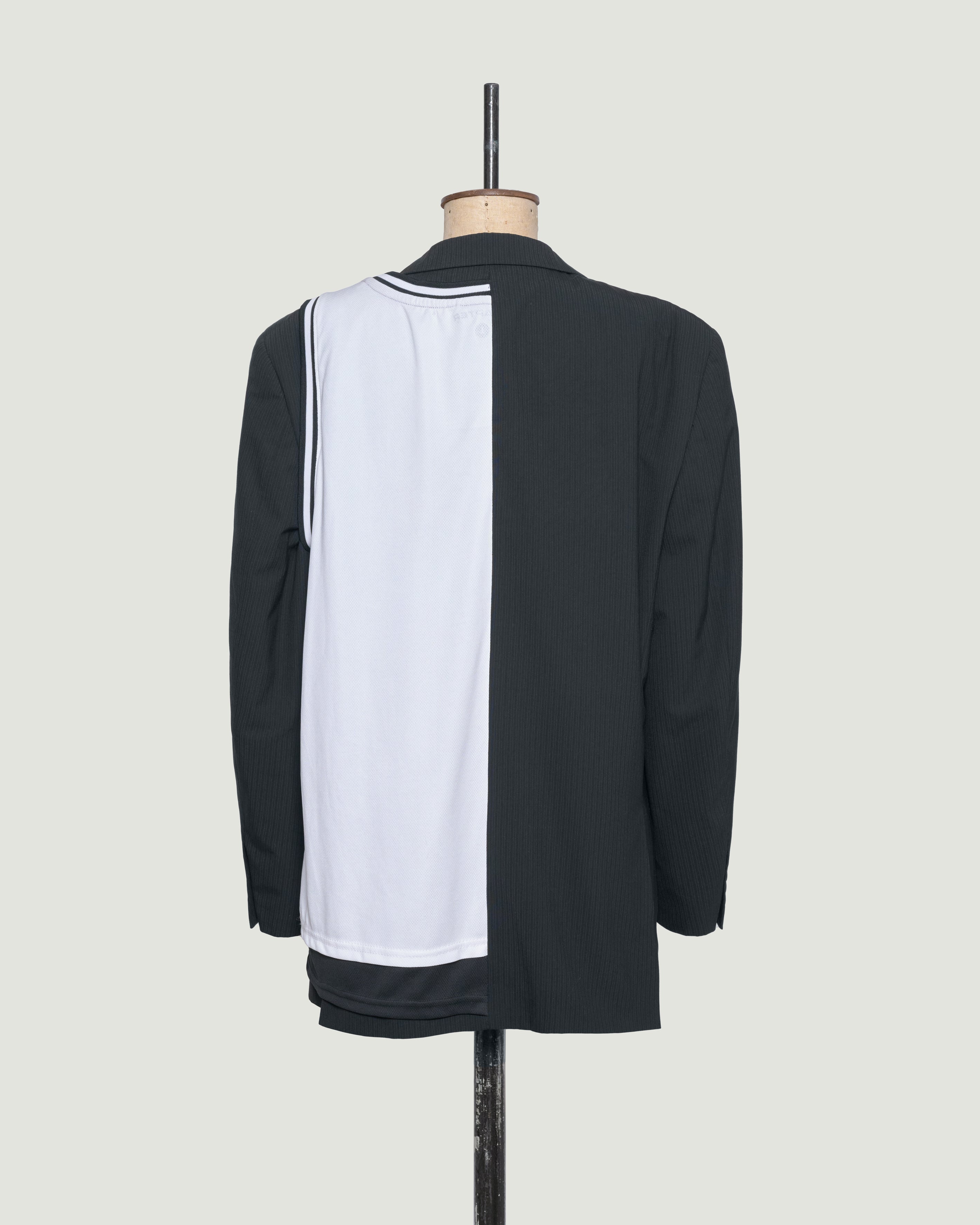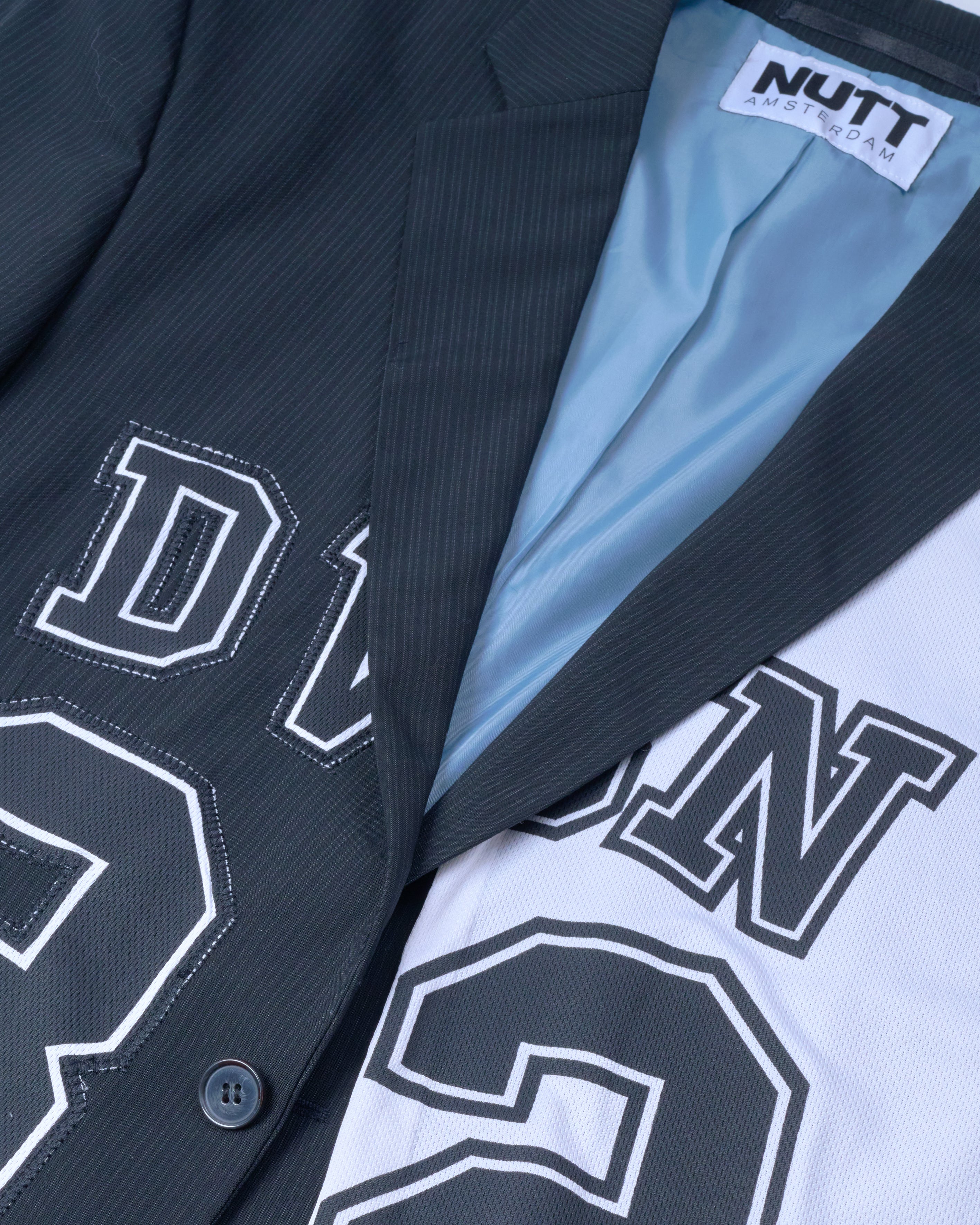 THIRTY TWO is een samengesteld design uit een zwarte afgedankte blazer en een nooit-meer-gedragen zwart-wit sportshirt. De blazer heeft een dynamische vlakverdeling op de rug en het front. De opgestikte cijfers en letters geven de blazer een sportieve look. Je draagt hem chic of casual, hij is passend of oversized en is voor iedereen.